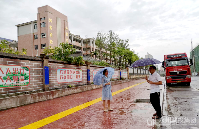 图为珍珠小学开学,方便师生、家长出行而建成的站前南路人行道