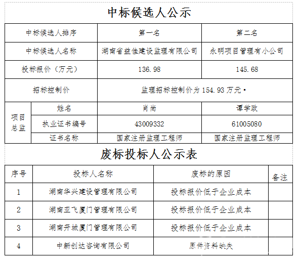根据招标投标相关法律法规及招标文件的规定,现将永城·福江苑项目监理中标候选人(排序)予以公示。公示期2020年3月5日至2020年3月10日。(公示期为3个工作日,公示期内如对中标候选人无异议,公示期满后,招标人将确定第一中标候选人为中标人), 公示期间招标人只受理投标人或者其他利害关系人有单位公章或个人署名的、对评标结果提出的异议。