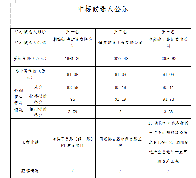 关于永州市南平路(零陵南路~湘江西路)道路工程湘江西岸片区南平路(零陵南路~湘江西路)道路工程施工招标中标候选人信息公示
