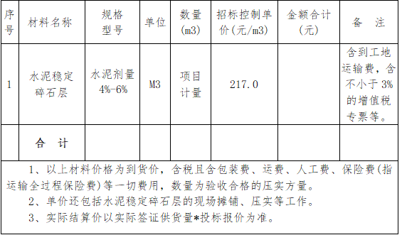 二、项目概况:根据我司对在建工程项目水泥稳定碎石层(水泥剂量4%-6%)的需求,初步估算2021年度需要水泥稳定碎石层量约15000立方米左右。为统一调配、集中供货施工,需要对水泥稳定碎石层(水泥剂量4%-6%)进行年度供货商招标。