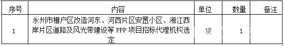 一、项目名称:永州市棚户区改造河东、河西片区安置小区、湘江西岸片区道路及风光带建设等PPP项目代理机构选定