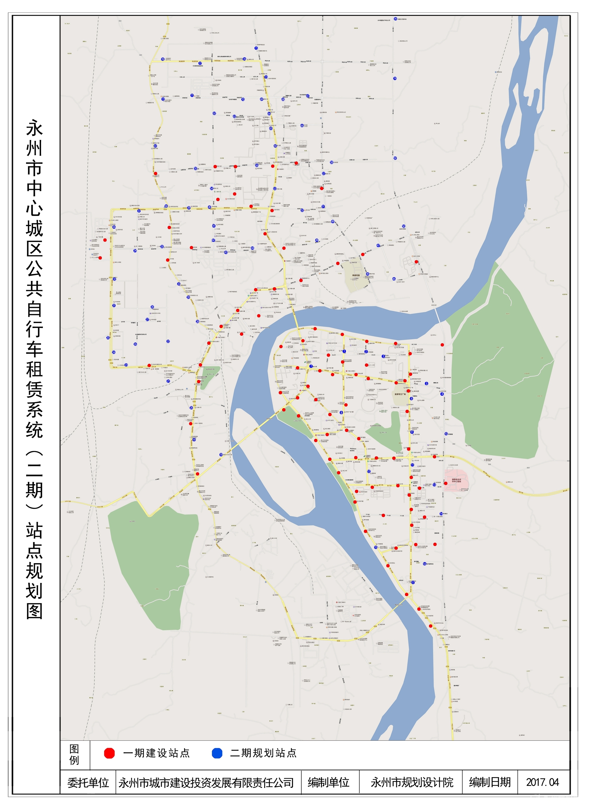 为方便市民绿色出行,缓解道路交通压力,完善城市交通系统,提升城市品位,根据市委、市政府的工作安排,近期,将在永州市中心城区建设公共自行车租赁系统(二期),对共自行车租赁系统(一期)项目建设进行完善和补充。城投集团组织设计规划单位对公共自行车租赁系统进行了实地勘察、科学调研,对具体建设站点进行了合理规划布局,并进行了单位内部审核,现将拟建站点规划情况公示如下: