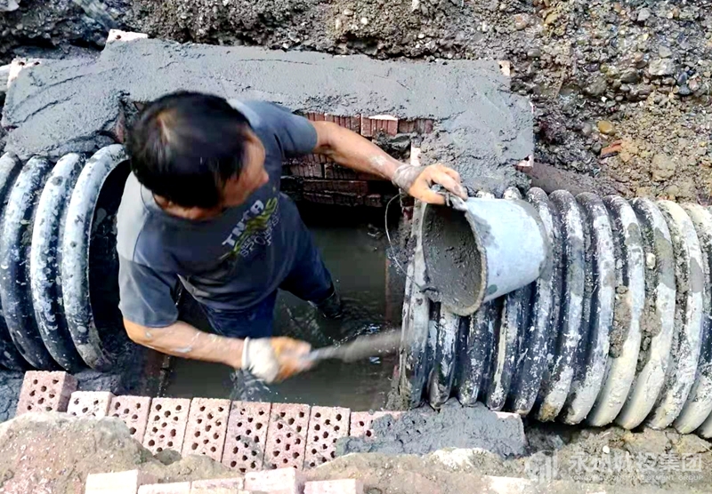 改造工程上足人力物力,现场施工人员8人,管理人员4人。投入挖机一台,切割机一台,斗车两个,发电机一台,混凝土振动棒一台。截止目前,已经完成50米沟槽开挖清运,45米排水管道护管浇筑,3座检查井砌筑。
