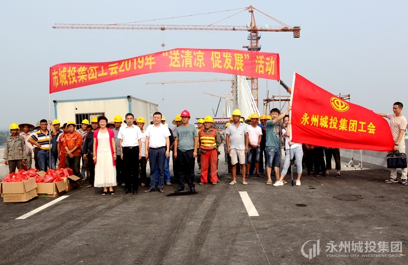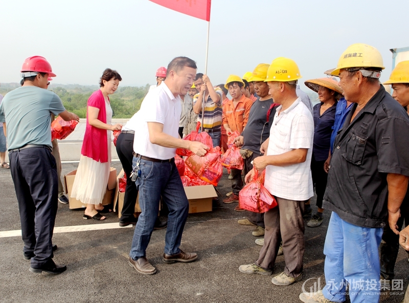 “在近期永州持续38摄氏度以上天气情况下,广大大桥建设者不畏高温,在岗位上挥汗如雨,我代表永州城投集团向你们表示感谢和慰问!”李世旺说,希望施工人员在确保大桥国庆节通车目标的同时,要进一步做好高温季节施工安全和劳动保护工作,保持健康的体魄和良好的心态投入紧张作业,为大桥顺利通车及永州高质量发展作出更大贡献。(办公室/张勖贤 工会)