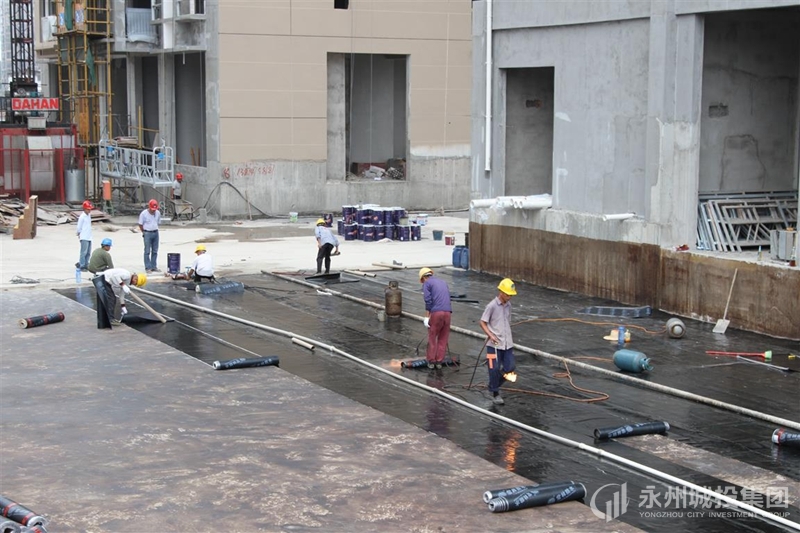 工人们正在贴地下室防水保护膜