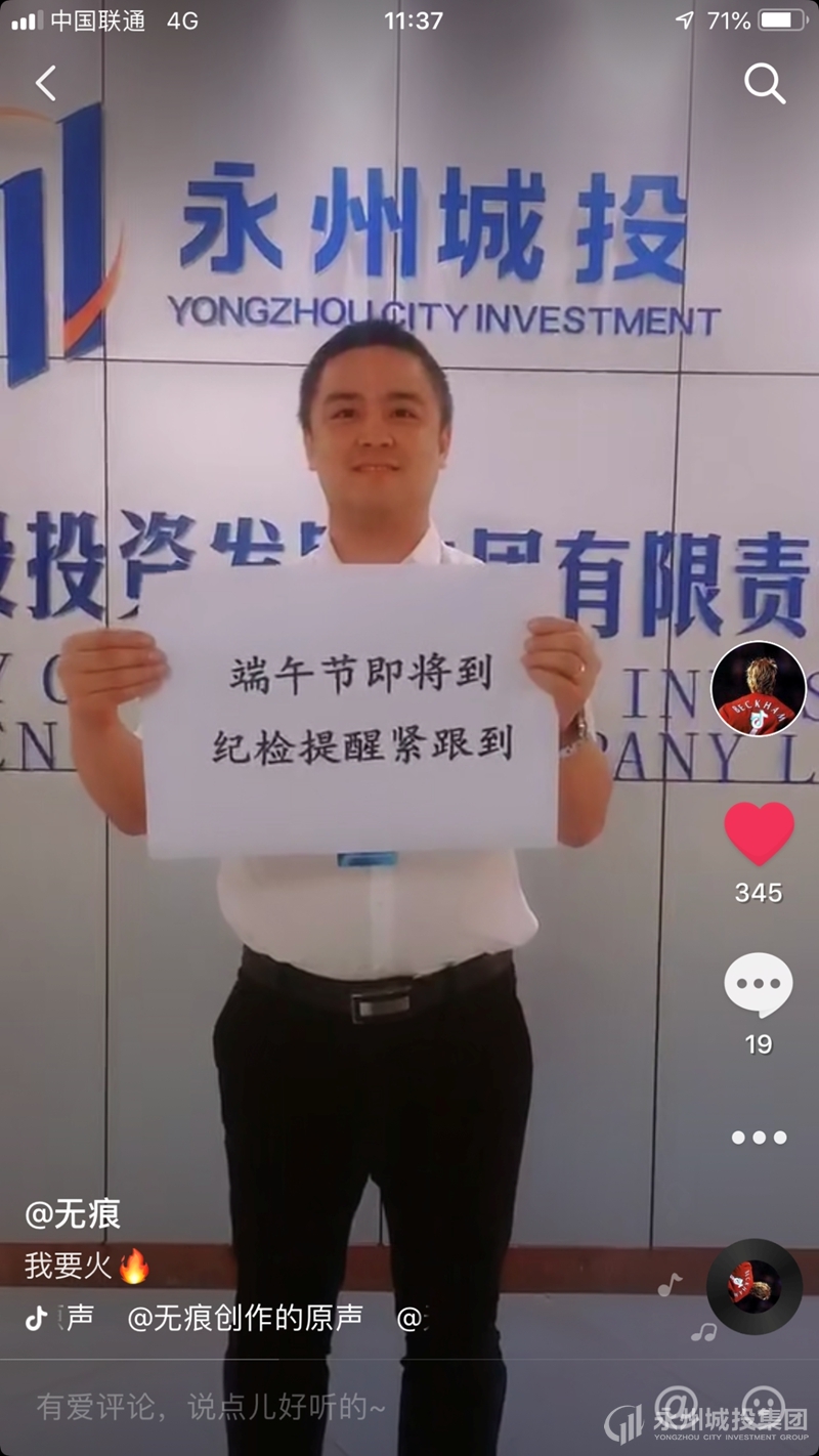 今年以来,为激励和引导广大党员干部树立良好的职业道德、精神追求,倡导清廉理念,永州城投纪委创新廉政教育方式,将传统的廉政教育模式与时下最火的抖音软件结合起来,发动青年干部的力量,围绕“清廉”主题,结合自身岗位特点积极创作抖音作品,特别是第一部作品发布上线后,短短一个小时就获得了2万多的播放量,在公司上下掀起了廉政教育的一股清新之风。