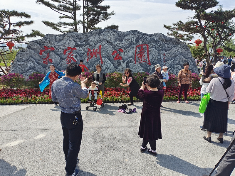 宋家洲公园入口处不少市民在拍照留念