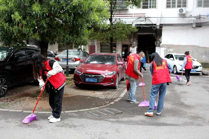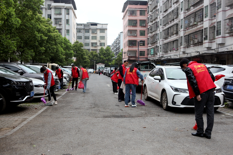 在社区所辖片区,志愿者们开展公共设施、公共环境清理,大家对停车场及楼栋周边公共绿化带垃圾进行清理,规范垃圾收集,劝导居民保护环境。