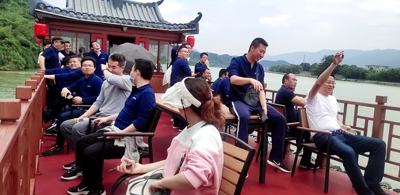 下午,在潇水河上开始了泛舟之旅。沿途青山连环、碧水奔流,让人流连忘返。游船上,大家一边吹着和煦的风,一边忙着拍摄秀丽的两岸风光,构成了一道“舟行碧波上,人在画中游”的美丽风景线。