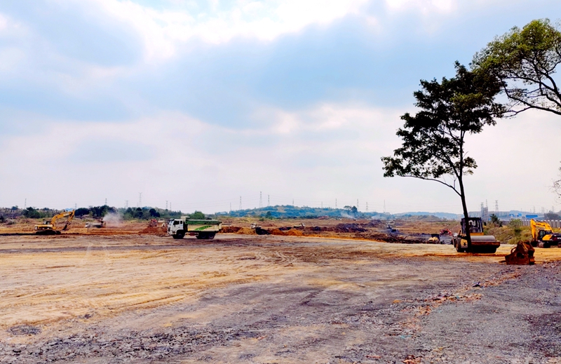 夏日炎炎,8月24日,在国际陆港智慧家居产业园标准厂房一期项目地块施工现场,10余台大型机械挥动着长臂气势如虹,机器轰鸣声如鼓乐齐鸣,60余台新型环保渣土车在工地川流不息,一派火热繁忙的景象。