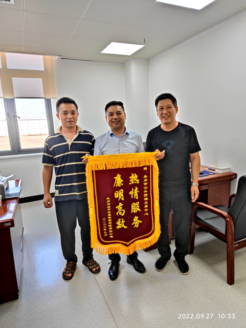9月27日上午,集团公司董事、总工程师李亚明带领咨询公司负责招标代理工作人员将一面印有“热情服务,廉明高效”的锦旗送到了永州市公共资源交易中心,对公共资源交易中心的招标审批服务表示衷心感谢。