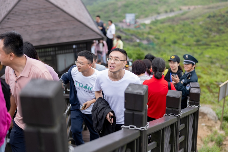 到达云冰山520台阶之下的吊桥边,集团副总经理蒋海民宣布春游活动正式开始。在导游的带领下,大家拾阶而上,开始了登顶云冰山的最后一段路程。台阶两边是