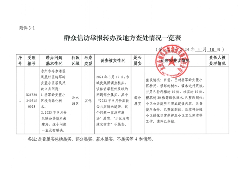 2024年3月17日,永州市城市发展集团有限责任公司、永州市城市建设有限公司、湖南省第六工程有限公司、永州市瑞丰实业发展有限公司相关人员到将军岭安置小区针对群众反映的问题现场调查核实,将军岭安置小区已建有草坪、灌木、乔木等实测地面绿地面积12856.67平方米,但还存在部分绿化乔木、灌木养护不到位,导致枯萎、损坏,未及时更换补种、养护问题。小区规划的公共厕所正在施工中,已完成土建、外墙、水电接入及部分室内装修,剩余洁具正在安装施工。